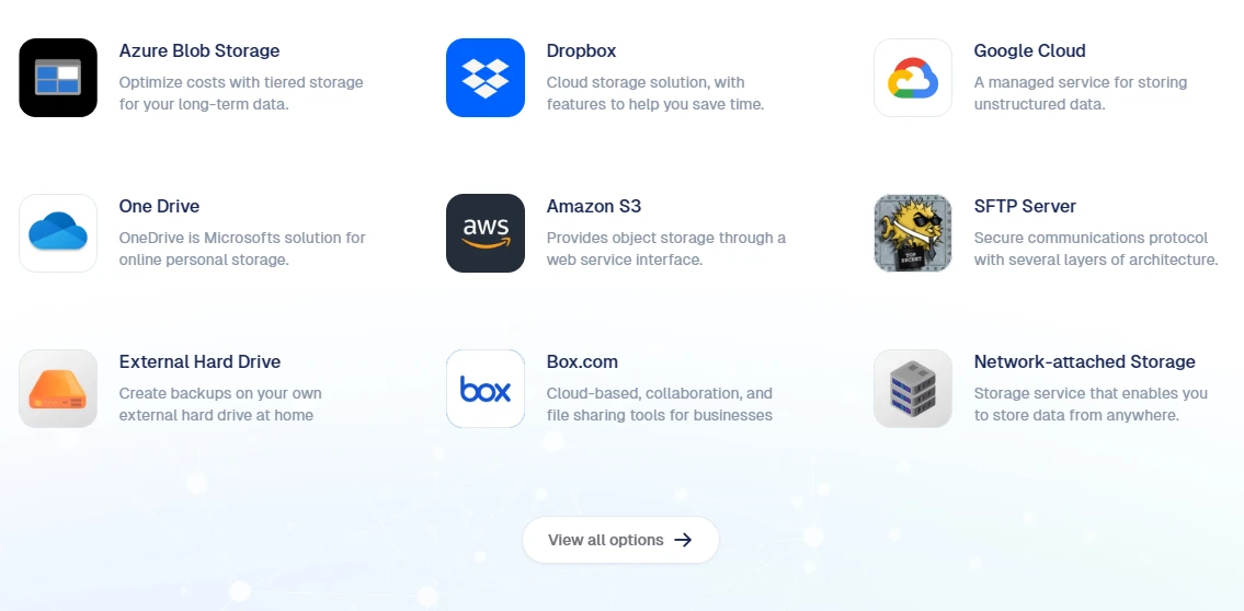 Duplicati works with a variety of storage providers, including Amazon S3, Google Drive, Microsoft OneDrive, and Backblaze B2, etc. Duplicati has many Integrations to choose from: