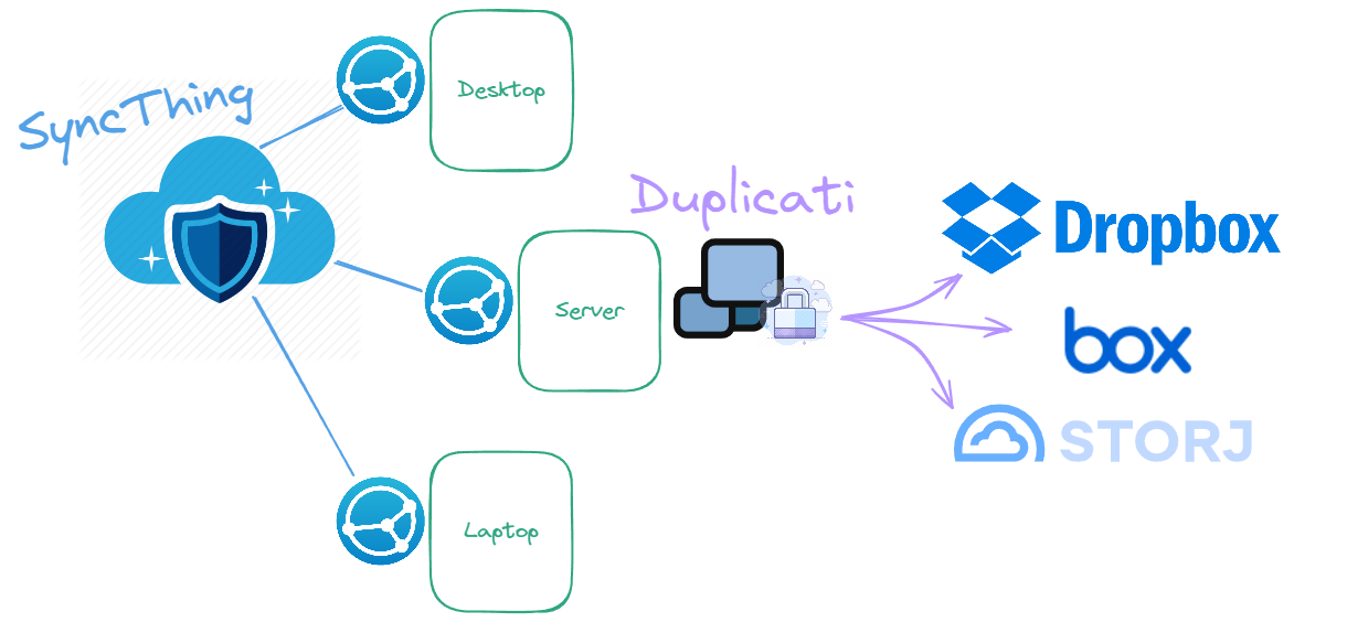 SyncThing will manage the synchronization of files between your devices, and Duplicati will handle the encrypted backup to a cloud storage provider of your choice. This approach combines the benefits of having files readily available across devices with the reliability and security of an encrypted offsite backup, protecting your data from loss and unauthorized access.