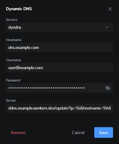 For more information, see the Unifi Gateway Dynamic DNS documentation. At the time of writing this, the following steps are how to configure the Unifi Gateway to call the Cloudflare Worker endpoint: